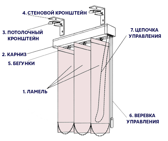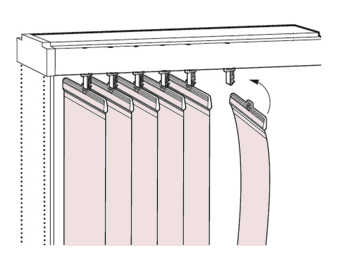 6. Вставить ламели в бегунки. Каждую ламель во время установки рекомендуется слегка потянуть вниз, чтобы убедиться, что она закреплена надежно